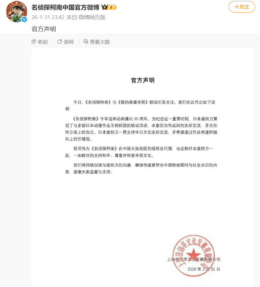 据名侦探柯南中国官方微博消息,1月31日深夜,《名侦探柯南》中国大陆地区版权总代理上海新创华文化发展有限公司发布官方声明: